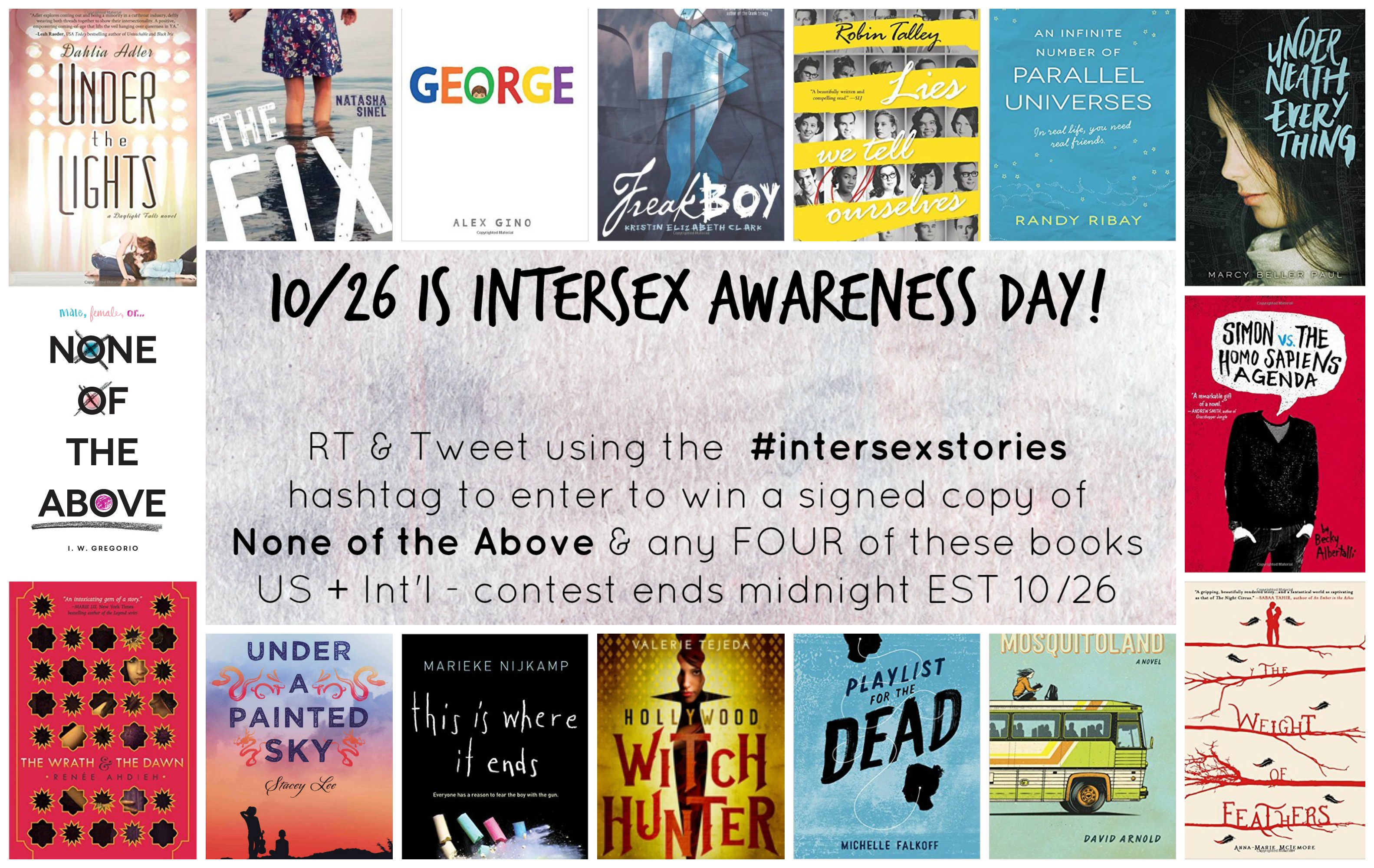 Pidgeon Pagonis (formerly of Advocates for Informed Choice and InterActYouth) is spearheading the effort to get #IntersexAwareness day to trend, so please do help her out and sign up for her TwitterStorm. And keep your eye for for my post on Why Intersex is Awesome on EpicReads – wherein some amazing author friends have chimed in with their own thoughts on why intersex awareness is important. To help celebrate their involvement in #intersexstories, I’m hosting a Rafflecopter giveaway for a signed copy of None of the Above and any FOUR of their books! Be sure to Post or Tweet why YOU think intersex is awesome tomorrow, using the HT #intersexstories.
